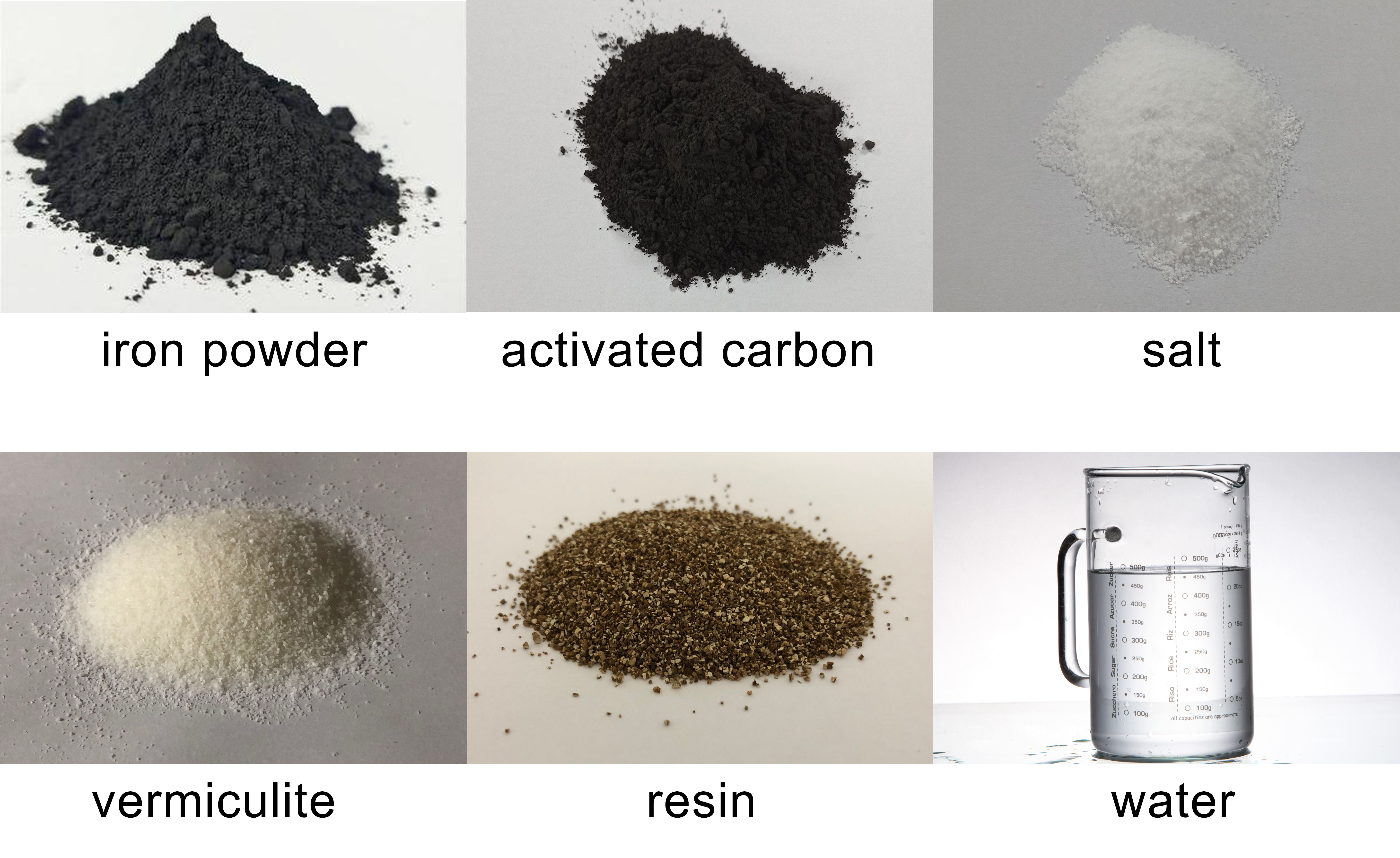 | सामग्री : | लौह शक्ति, सक्रिय कार्बन, नमक, वर्मीक्यूलाईट, राल, पानी, आदि। |
